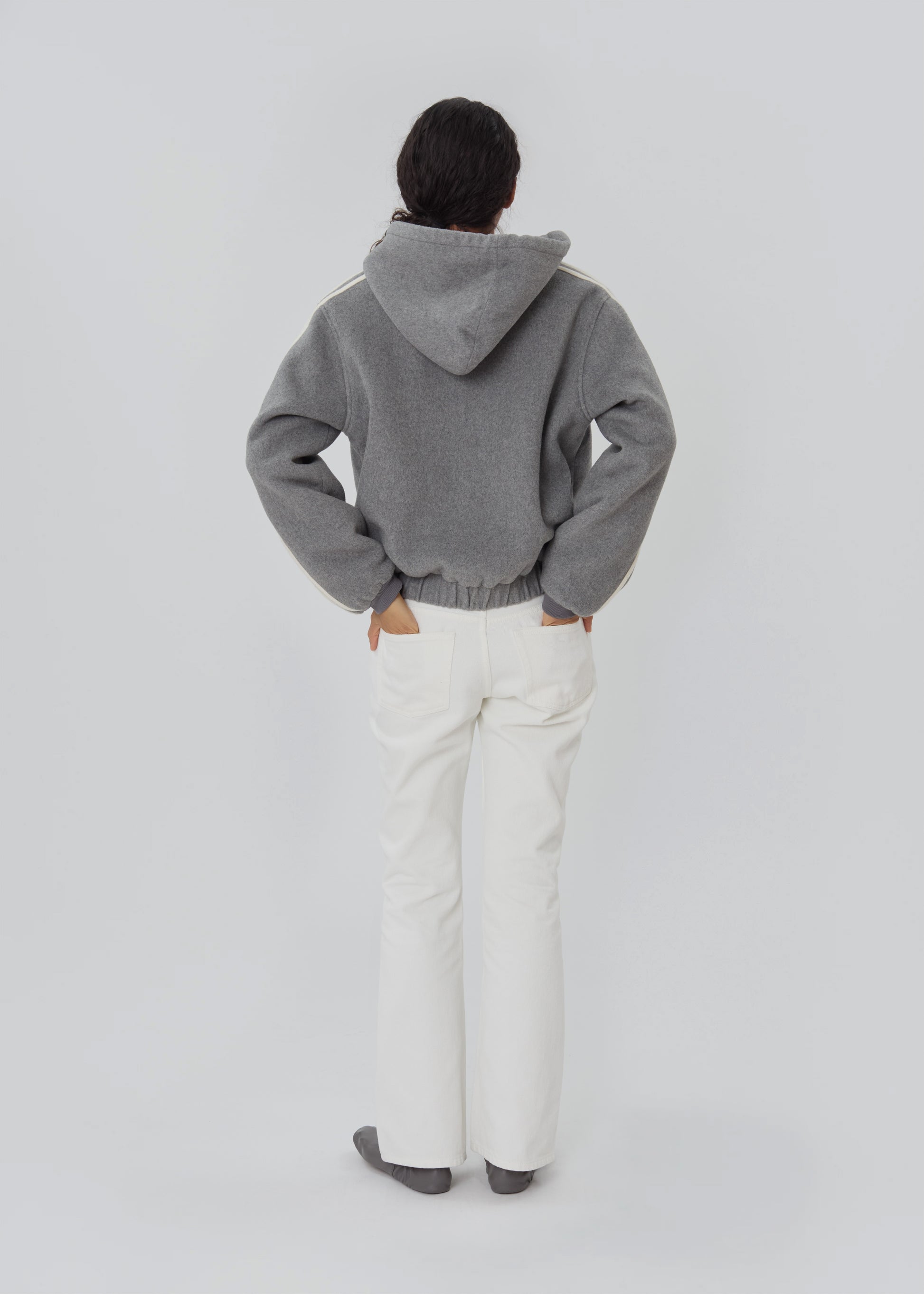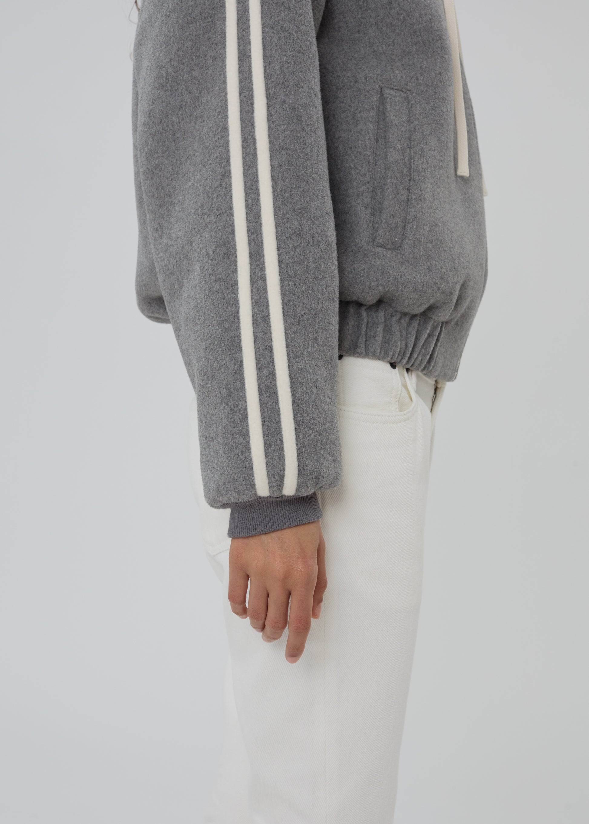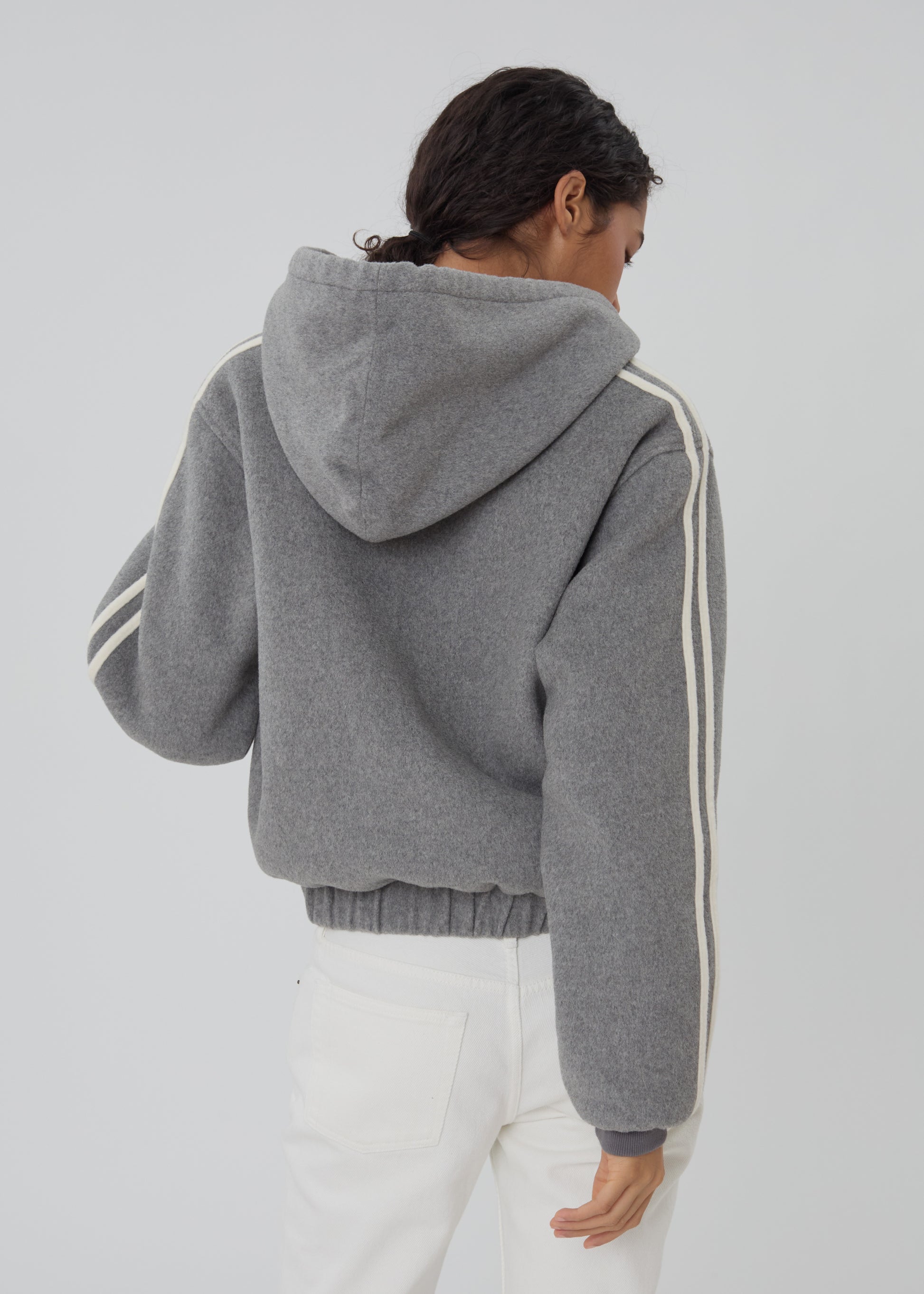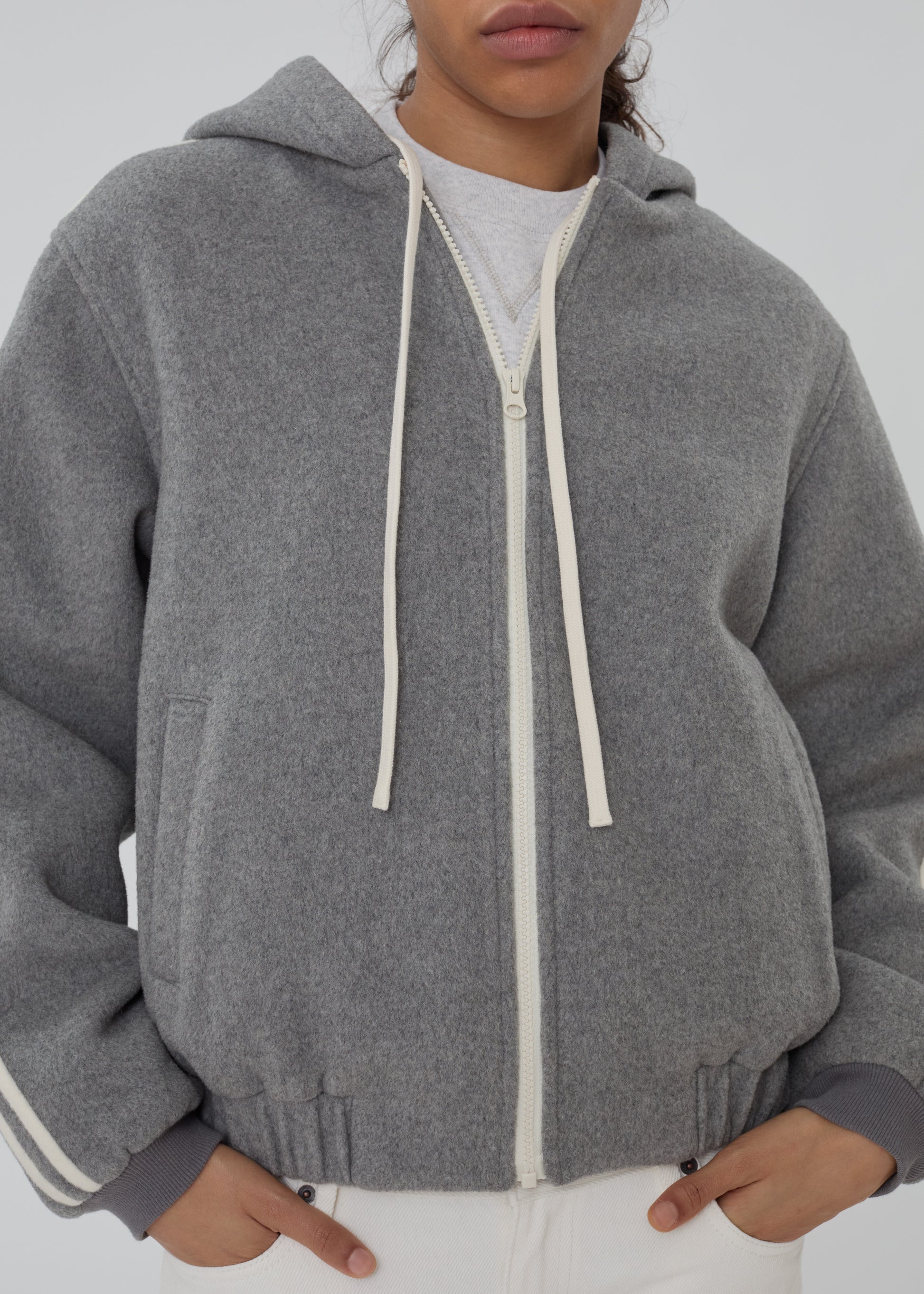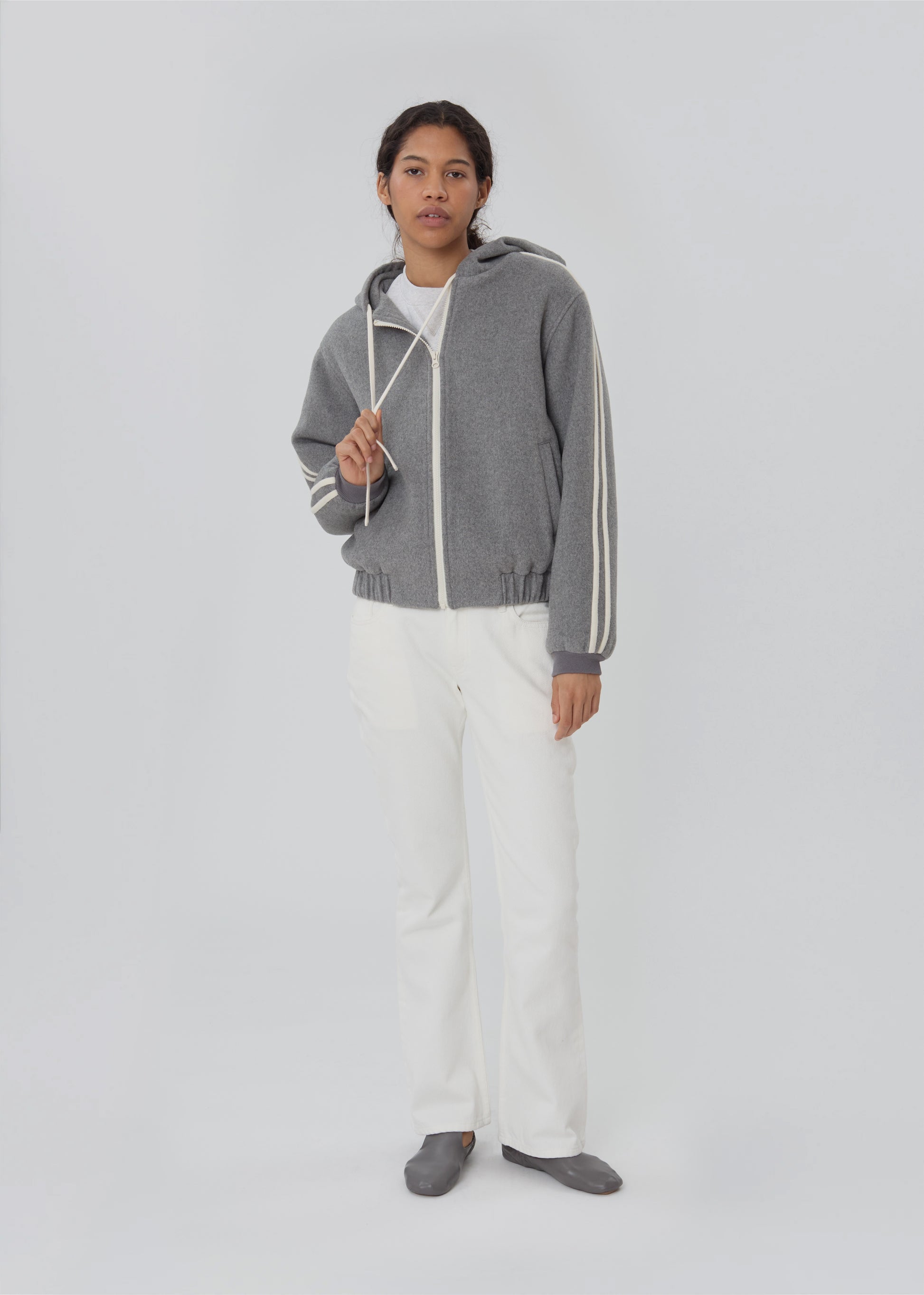 The Boyfriend Zip is an oversized hooded wool jacket featuring a silky lining, front hand pockets, and racer stripes down the arms.