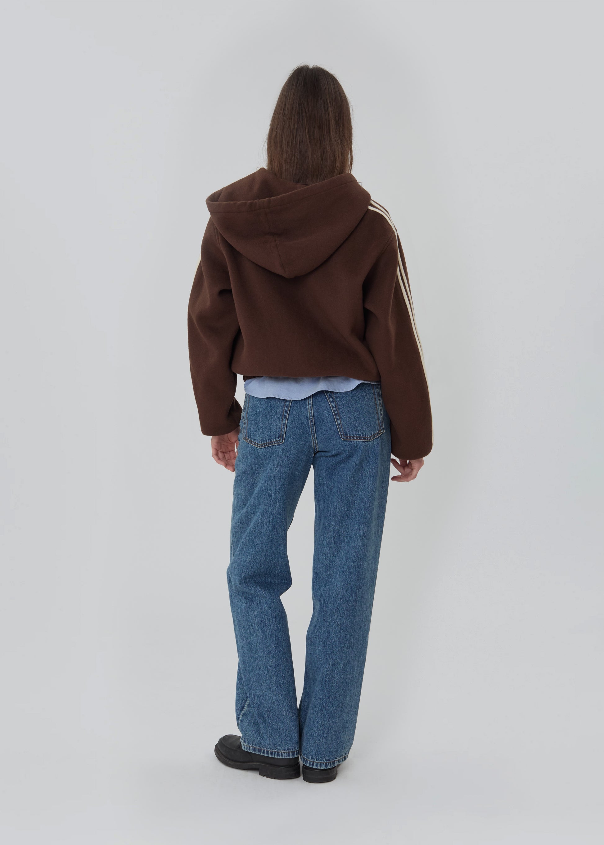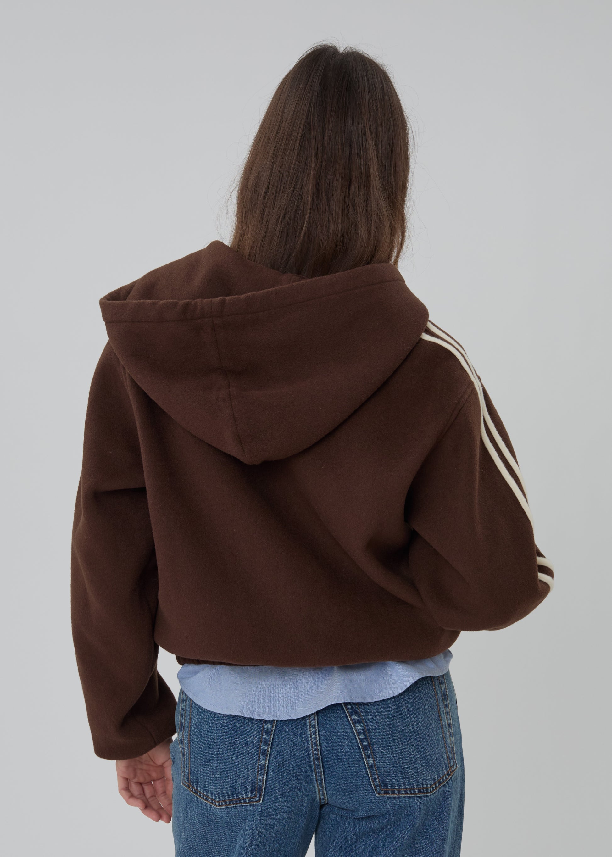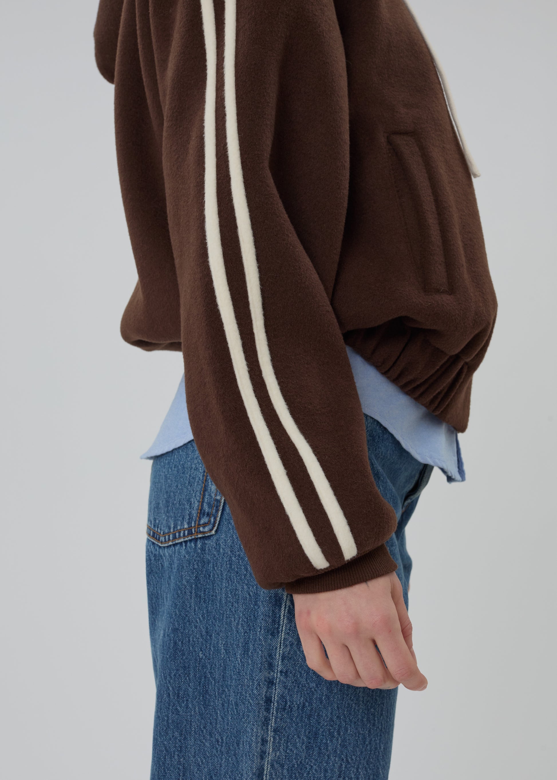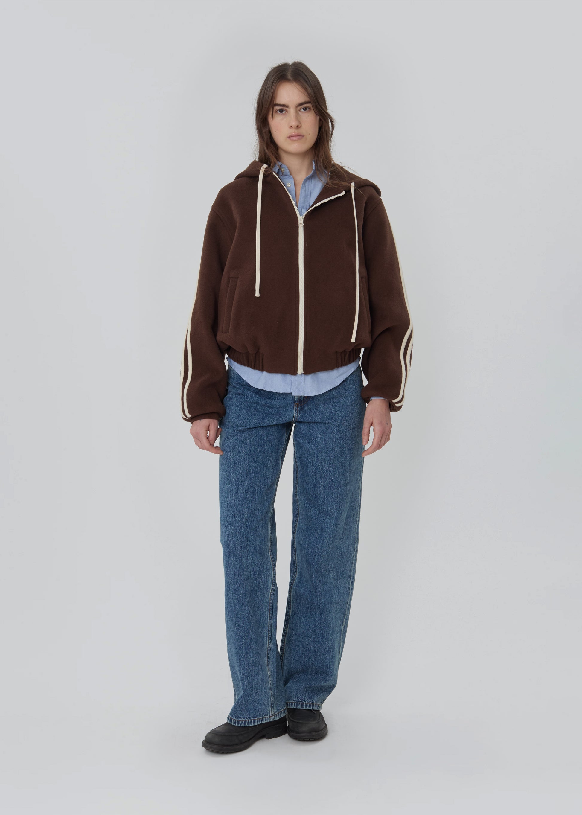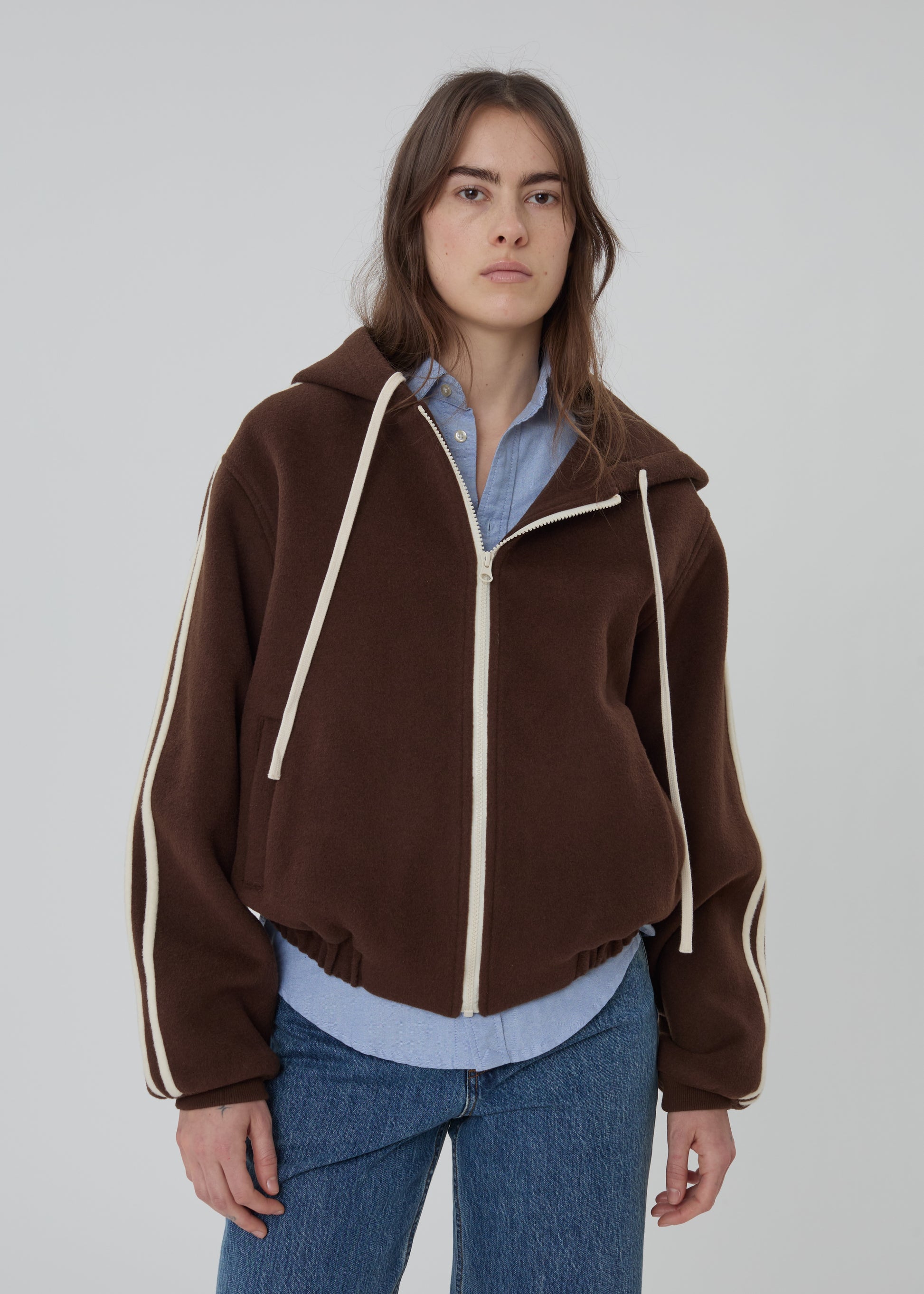 The Boyfriend Zip is an oversized hooded wool jacket featuring a silky lining, front hand pockets, and racer stripes down the arms.
