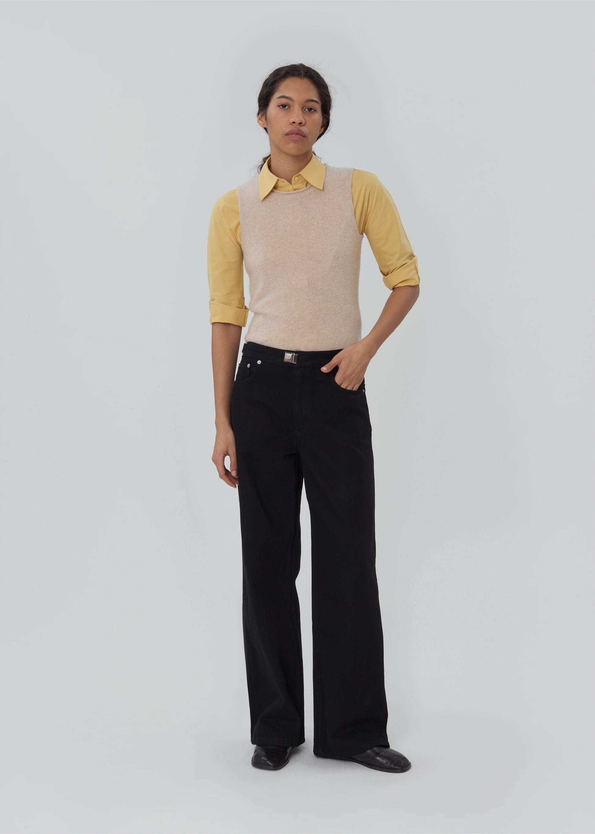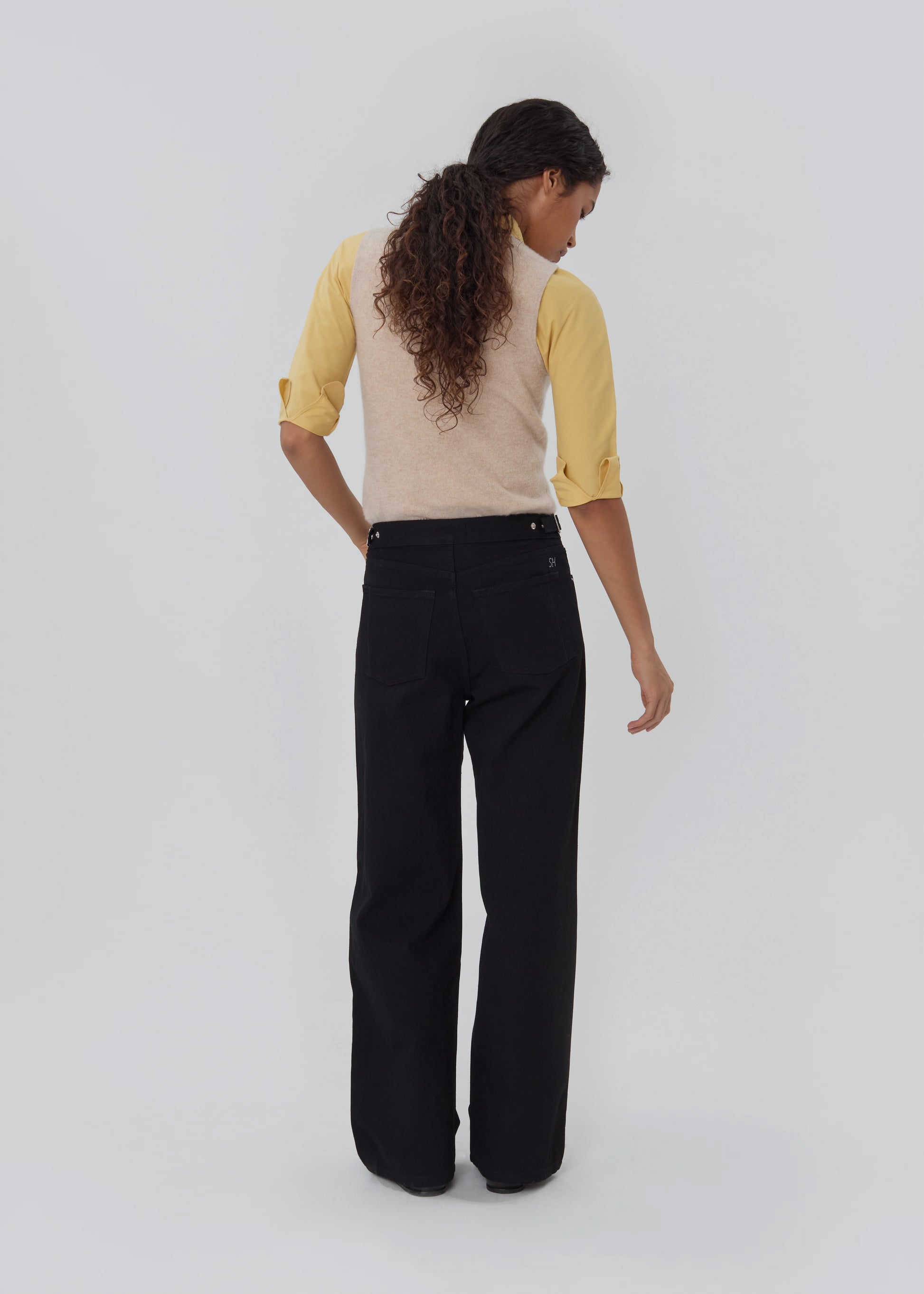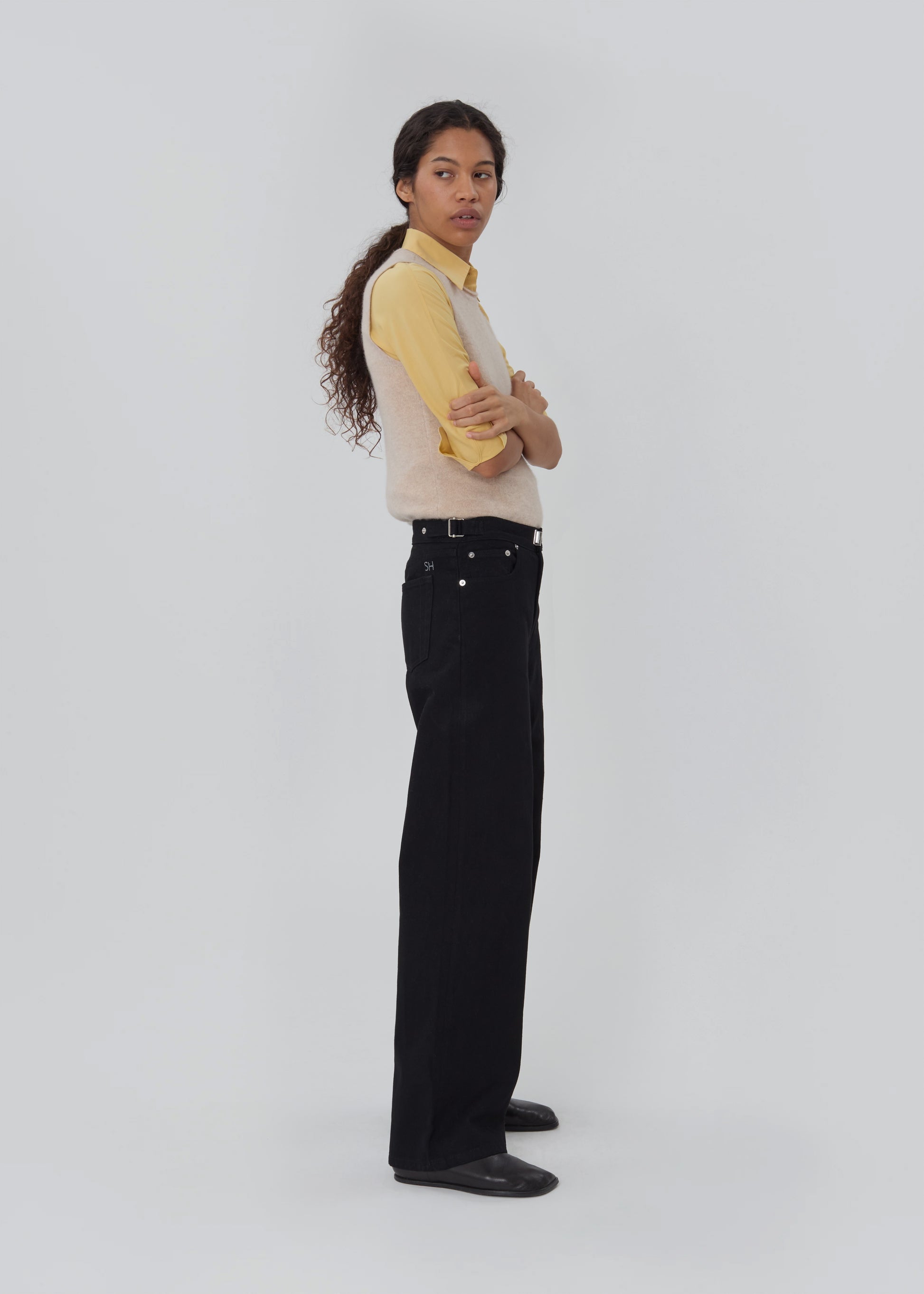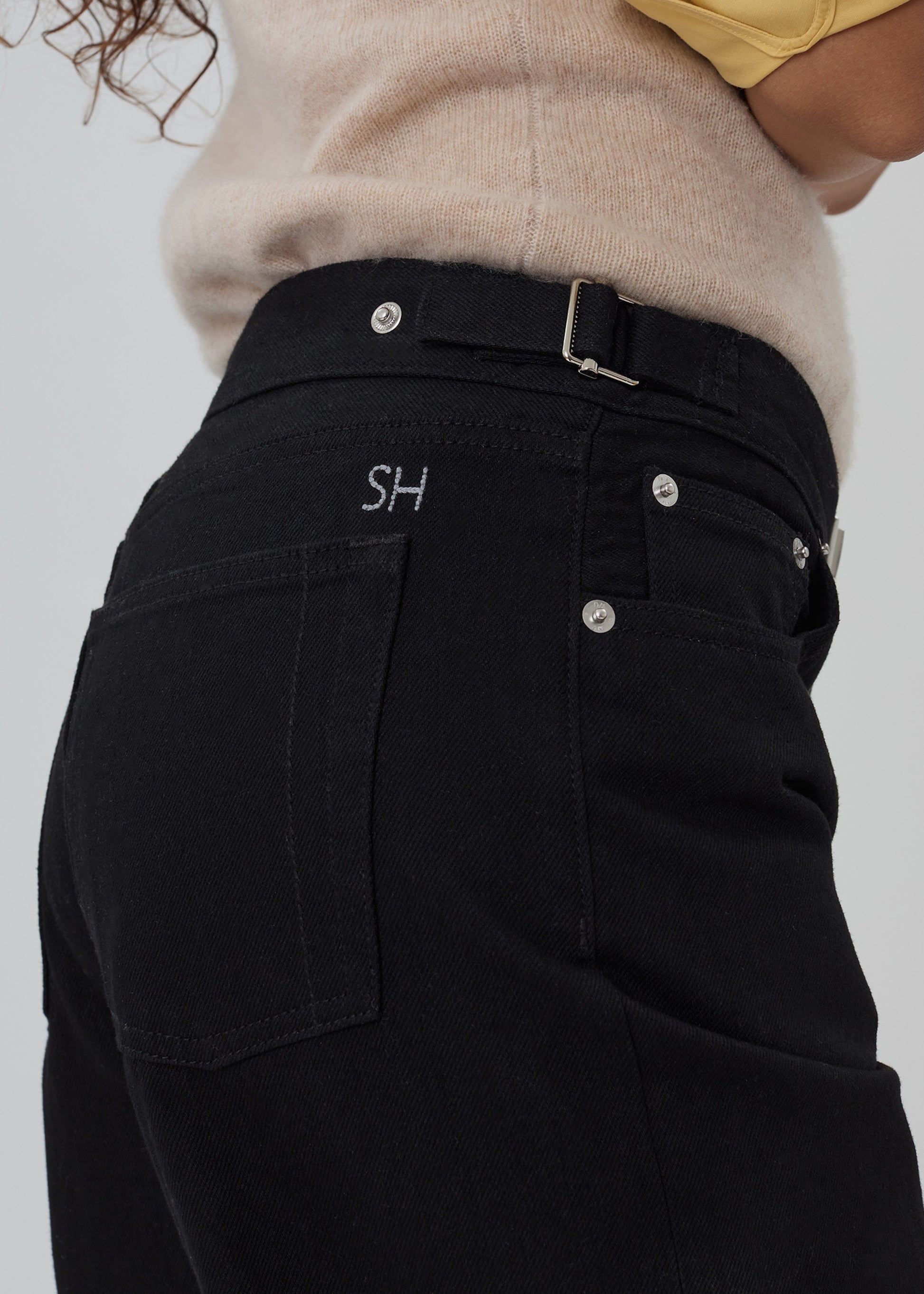 The Buckle Jean is a relaxed leg, subtle drop-crotch jean. It features our custom chrome buckle hardware and adjustable waistband side fasteners, allowing it to be worn as both a mid or low-rise jean.