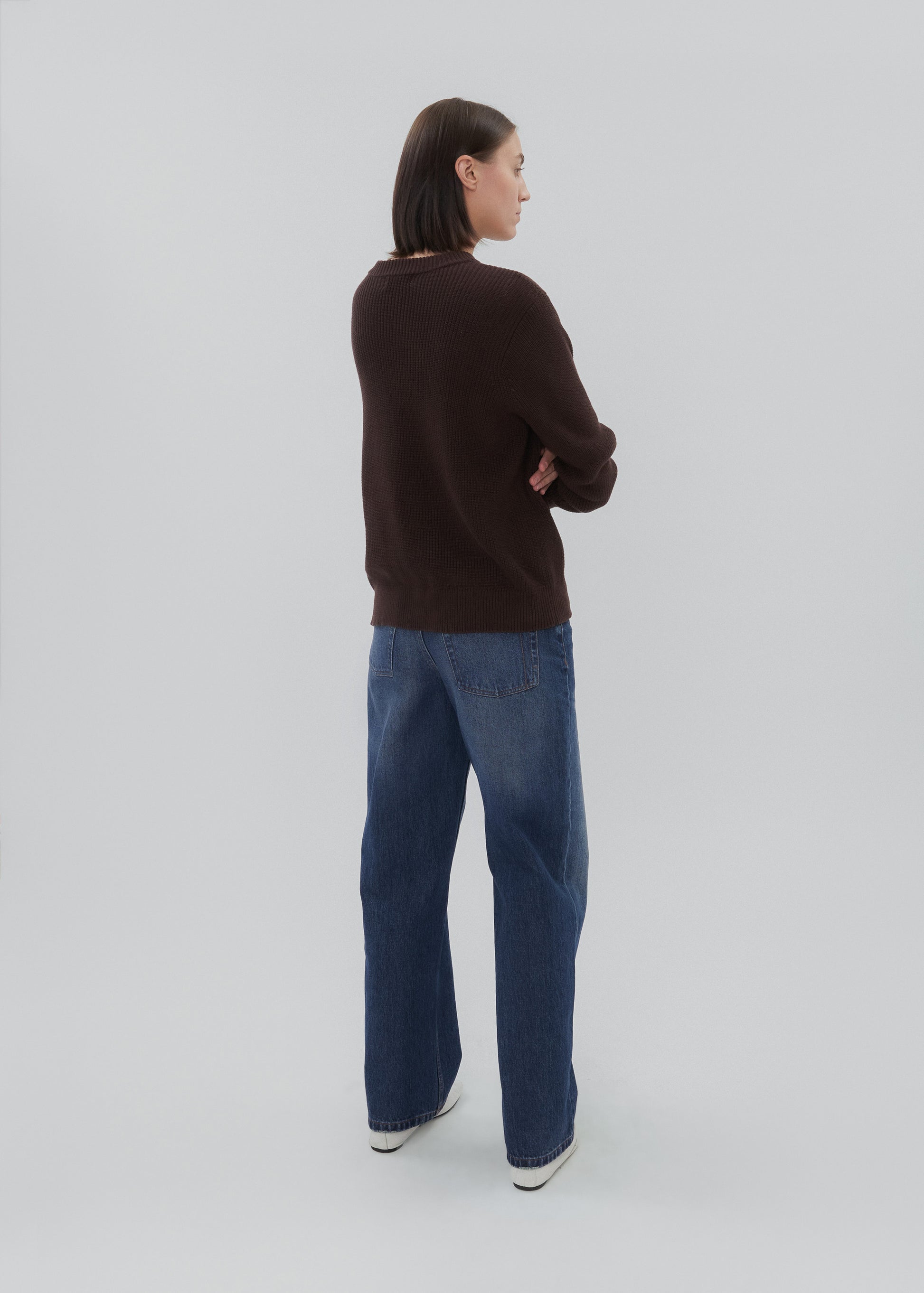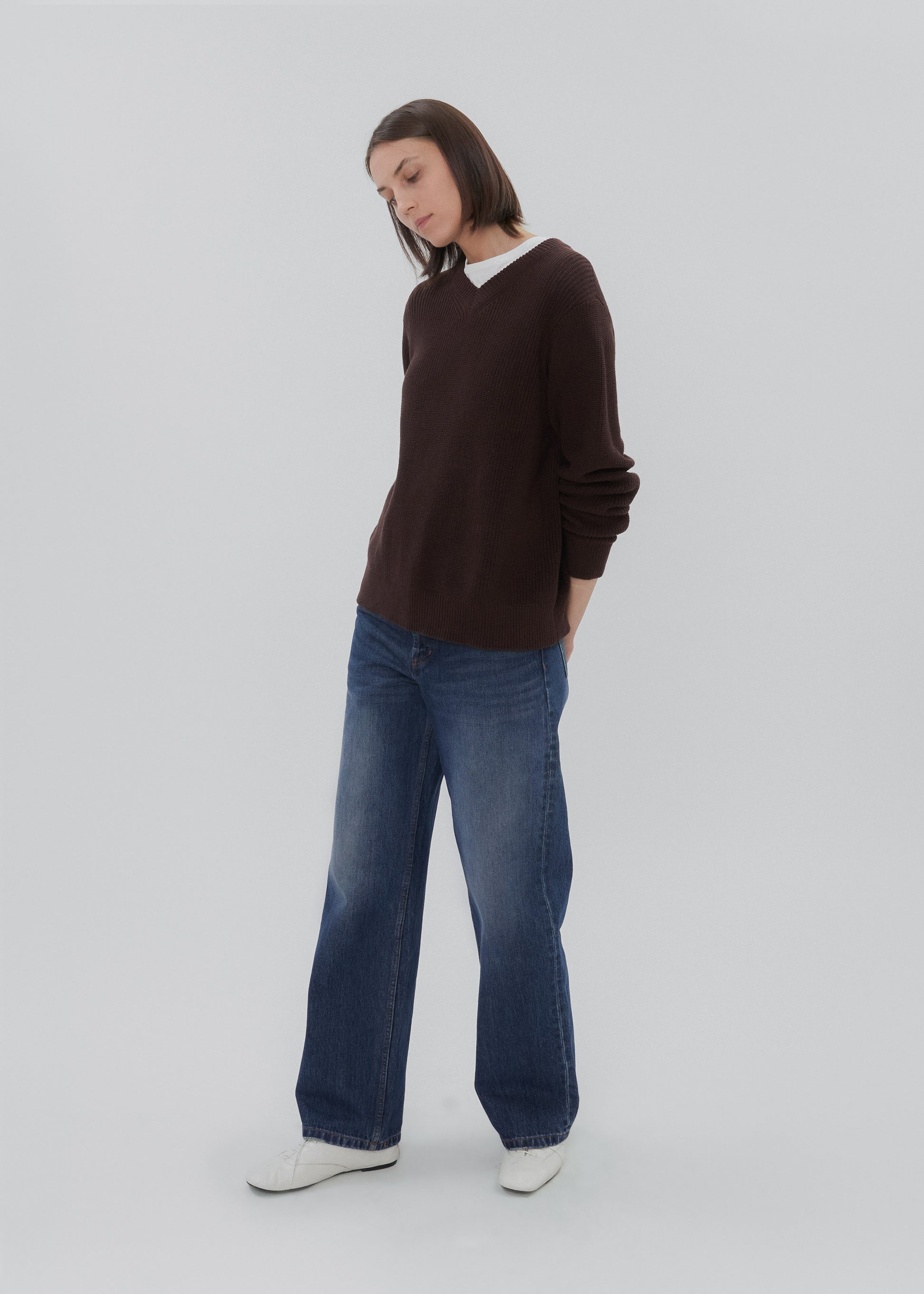 The Hotel Sweater is a long sleeve cotton knit sweater featuring a high V-neck.