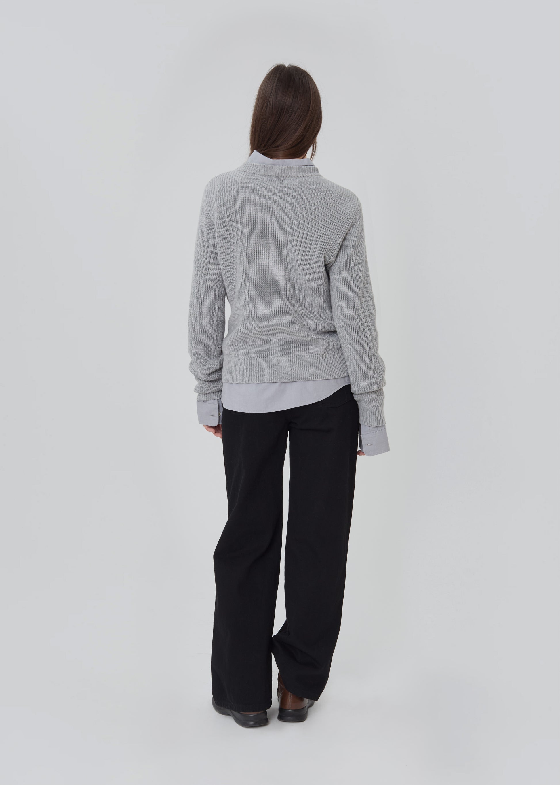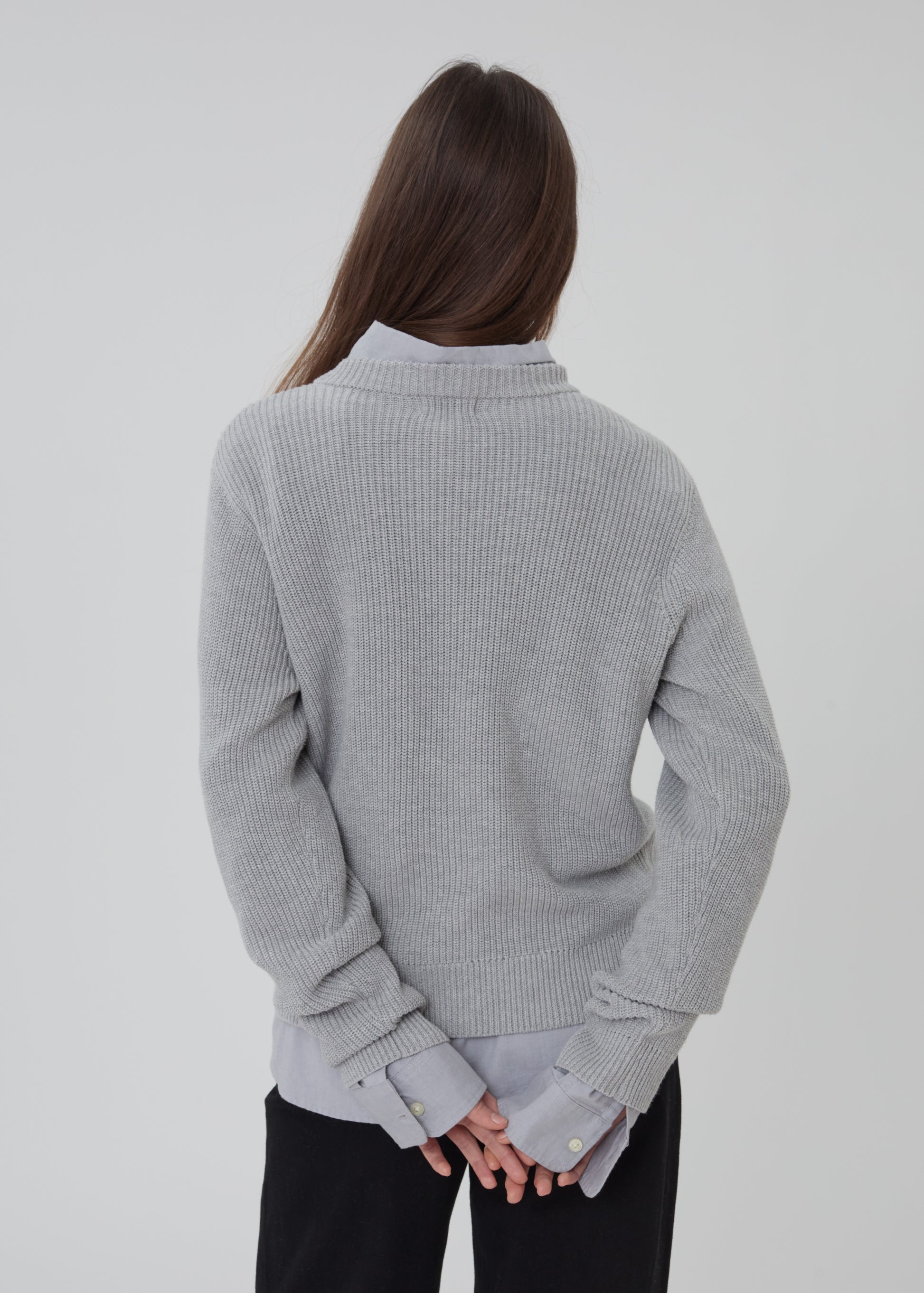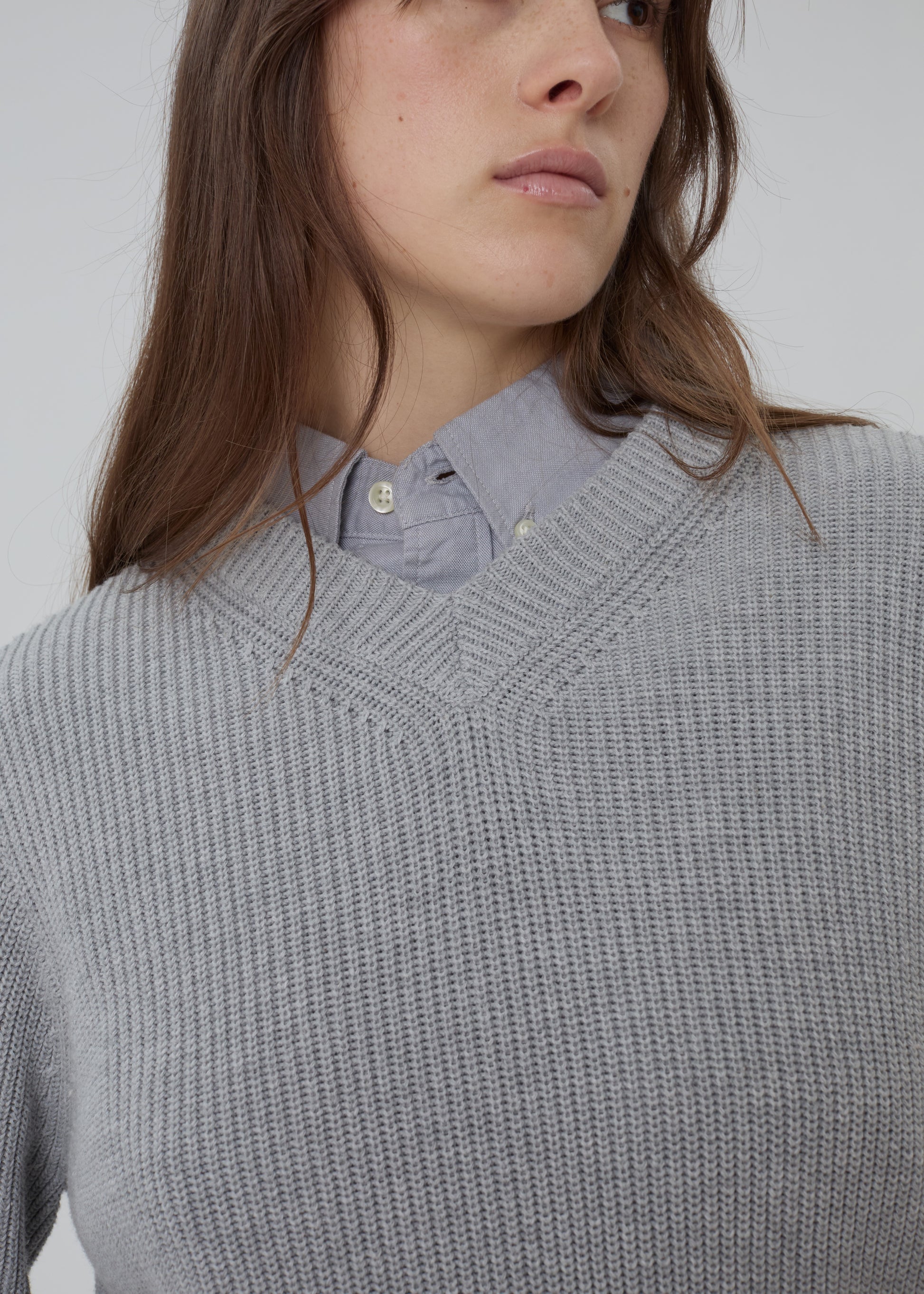 The Hotel Sweater is a long sleeve cotton knit sweater featuring a high v-neck.