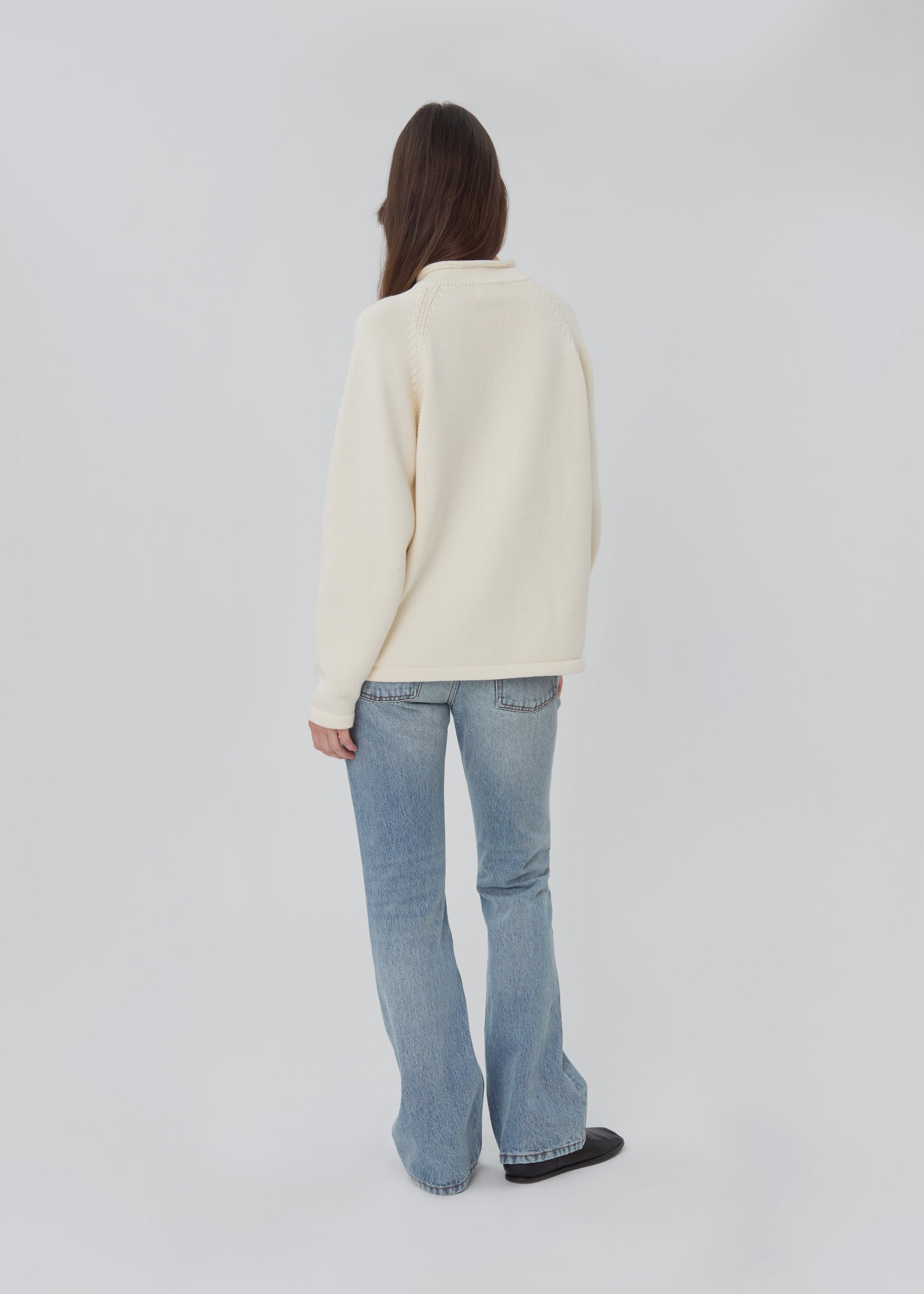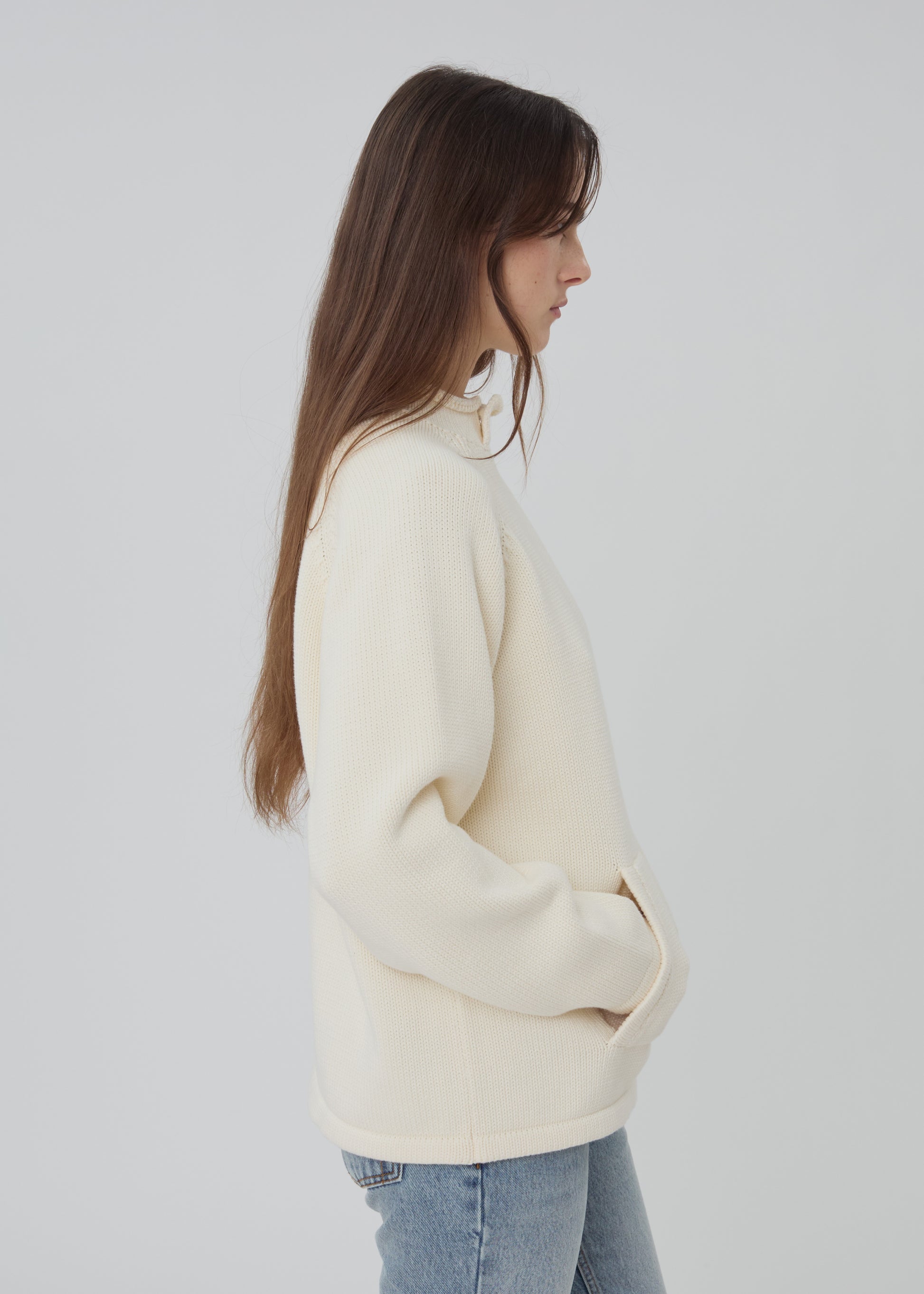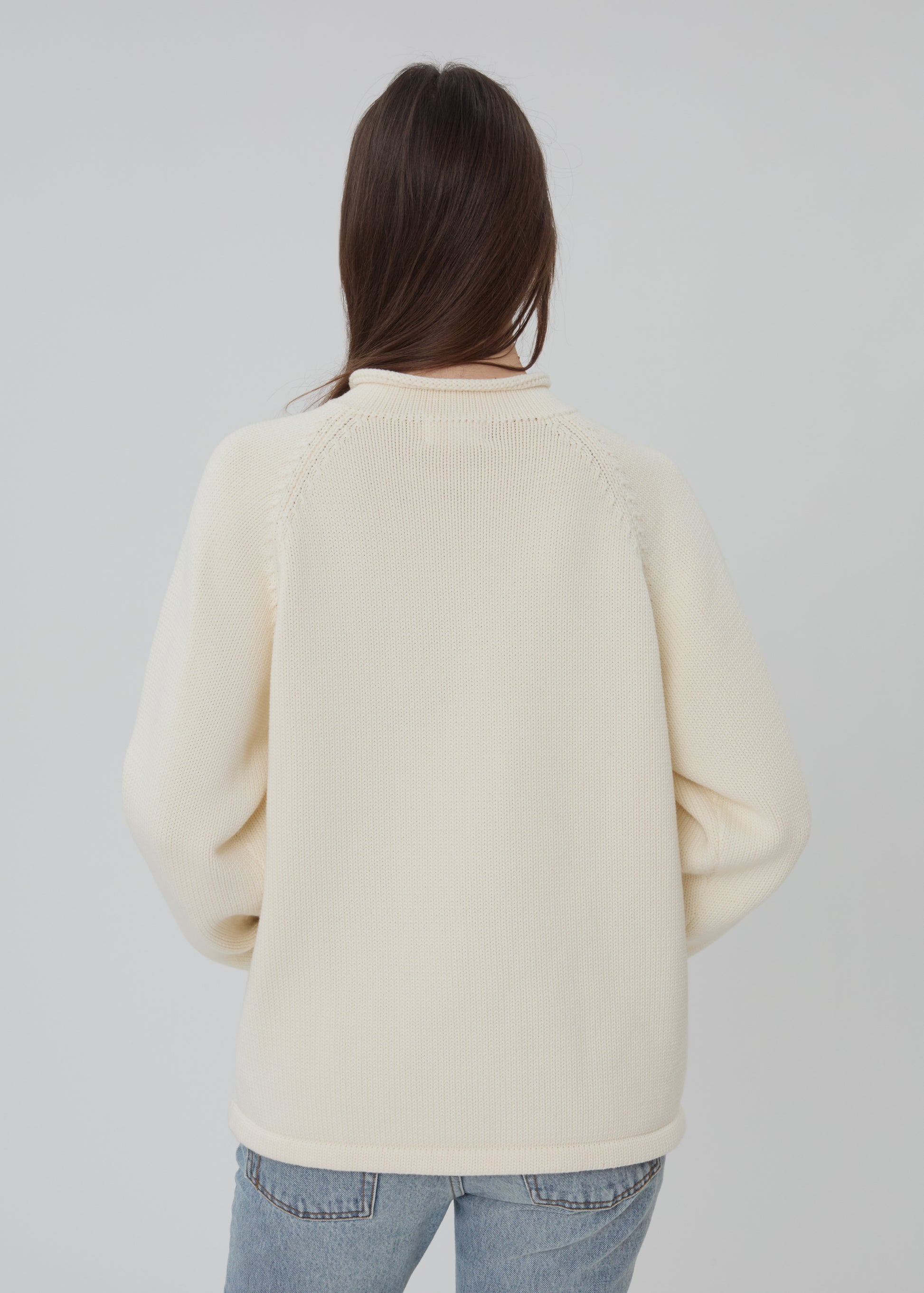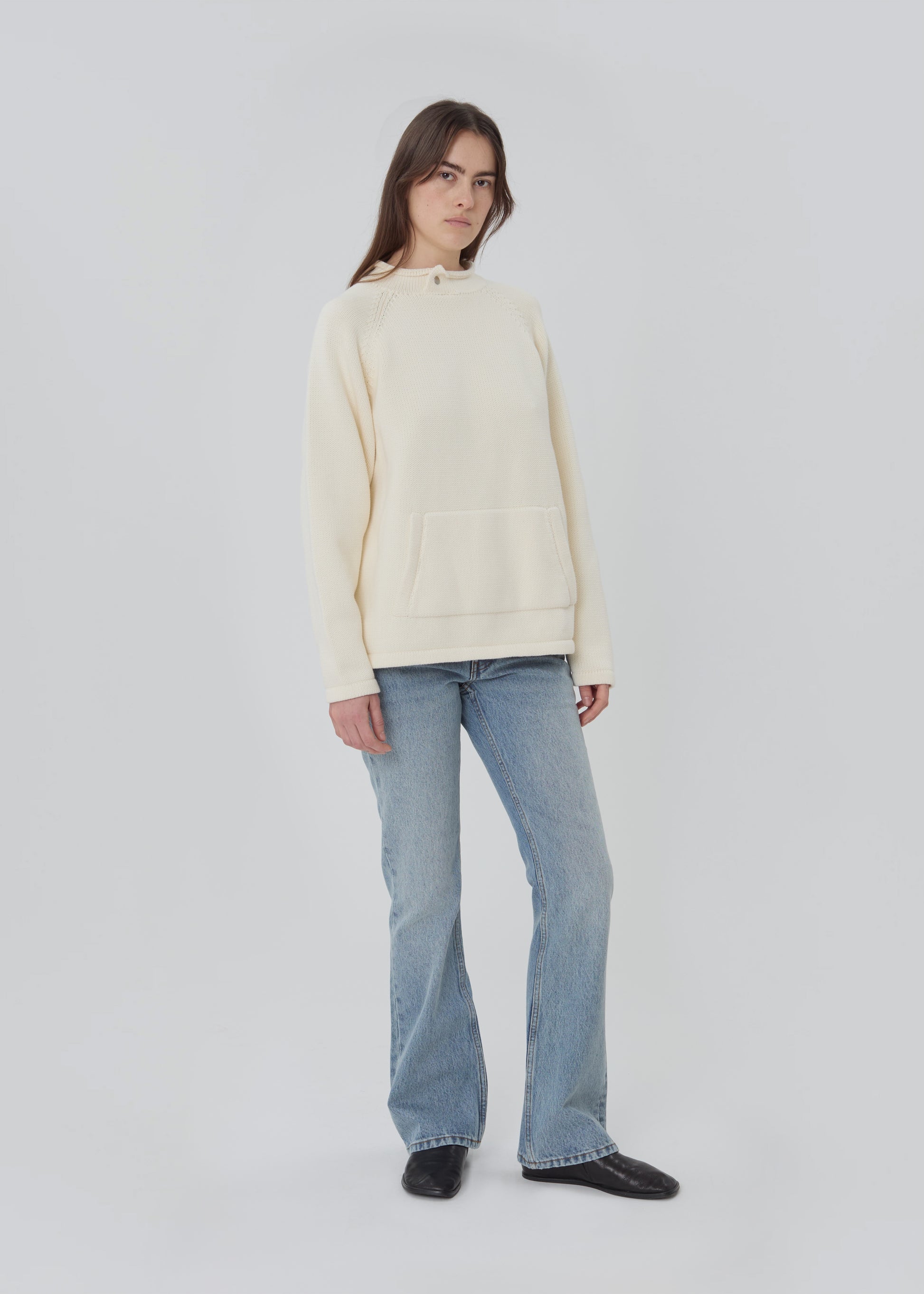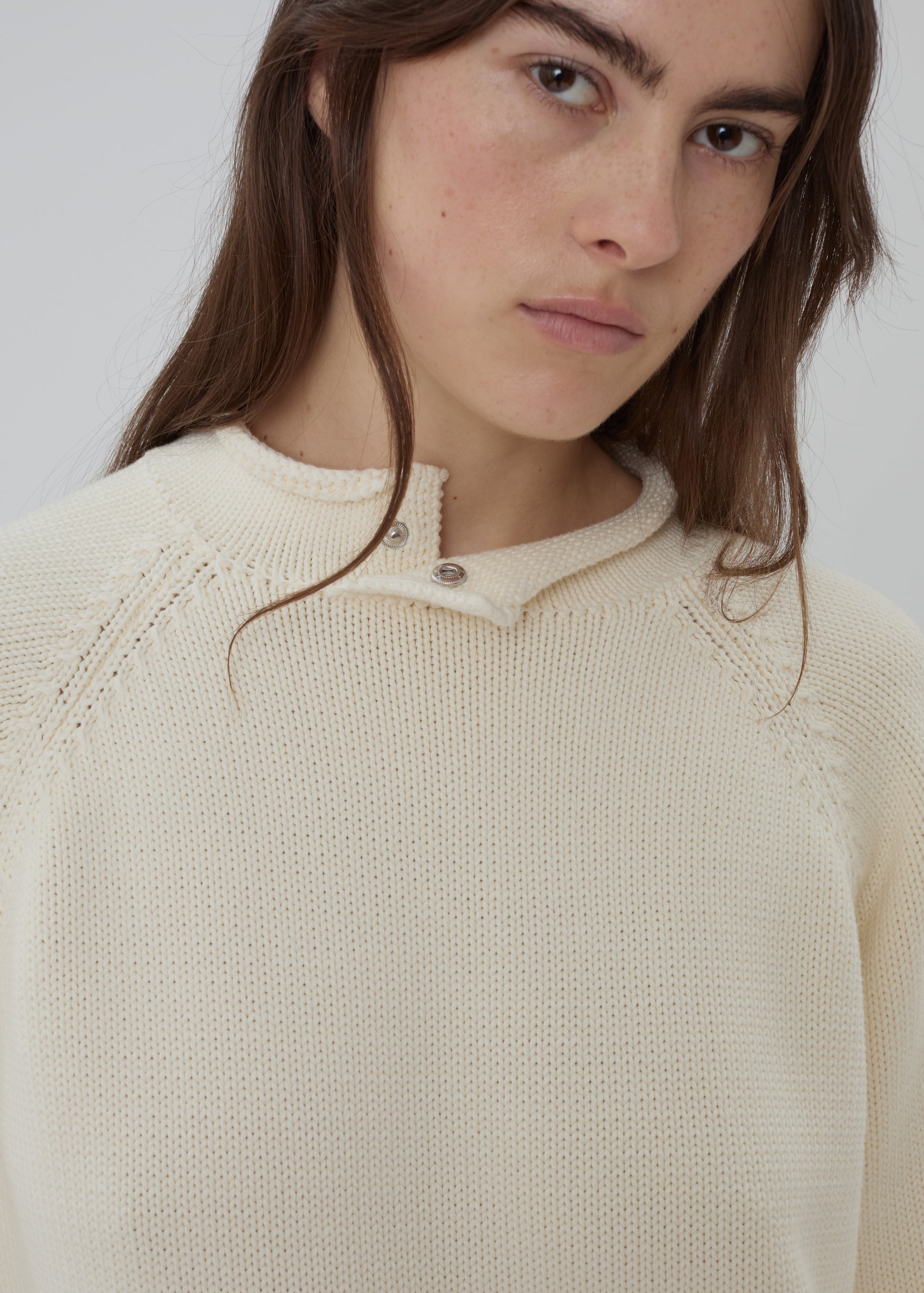 The Snap Collar Sweater is an oversized cotton knit sweater with a snap-collar detail and a single front pouch pocket.