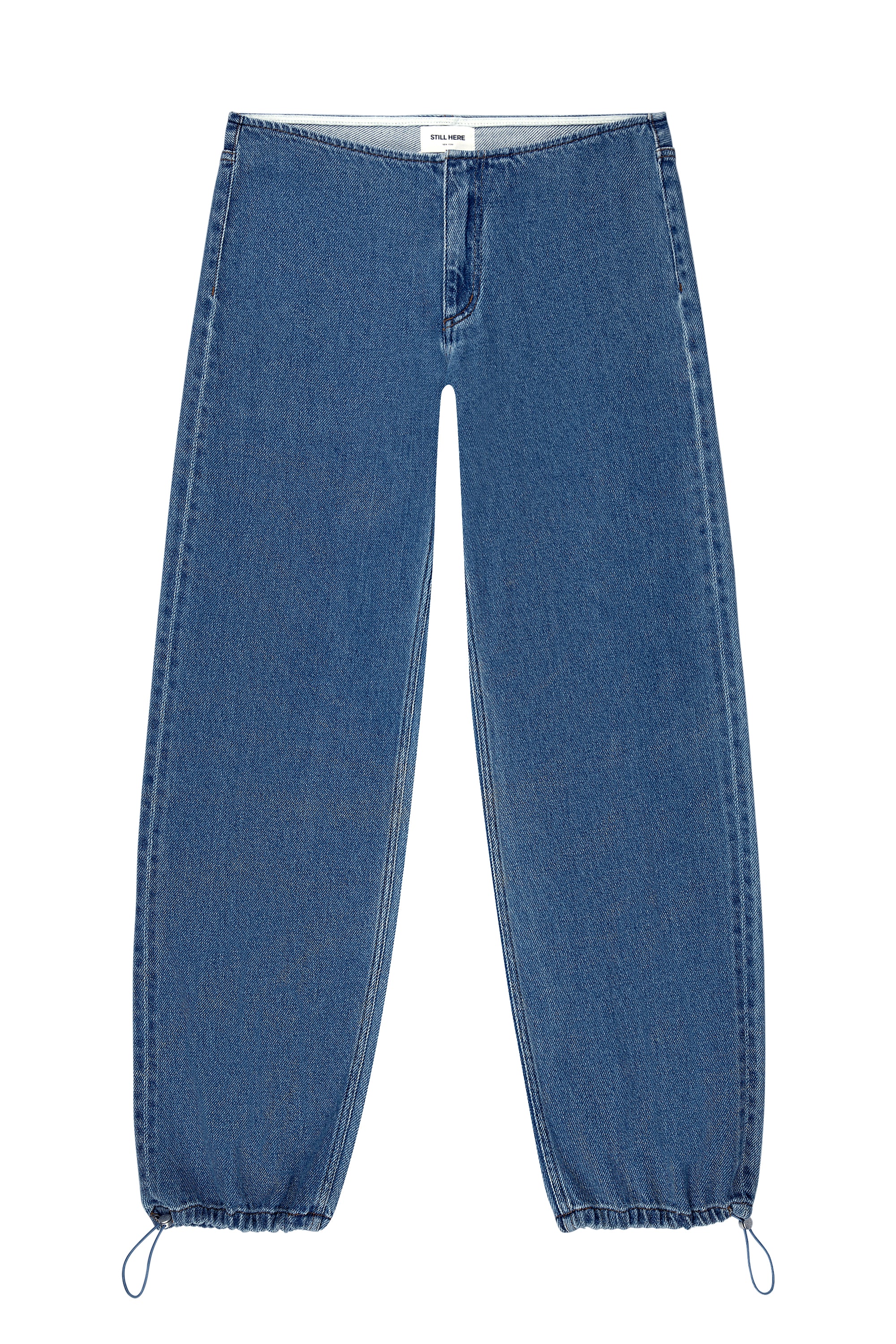 The Sport Jean is a low-rise, relaxed-leg jean with drawstring toggles at both hems, allowing for both a cinched jeanie leg or straight leg wear. Featuring a waistband-free construction and a discreet zipper closure for an uninterrupted silhouette.