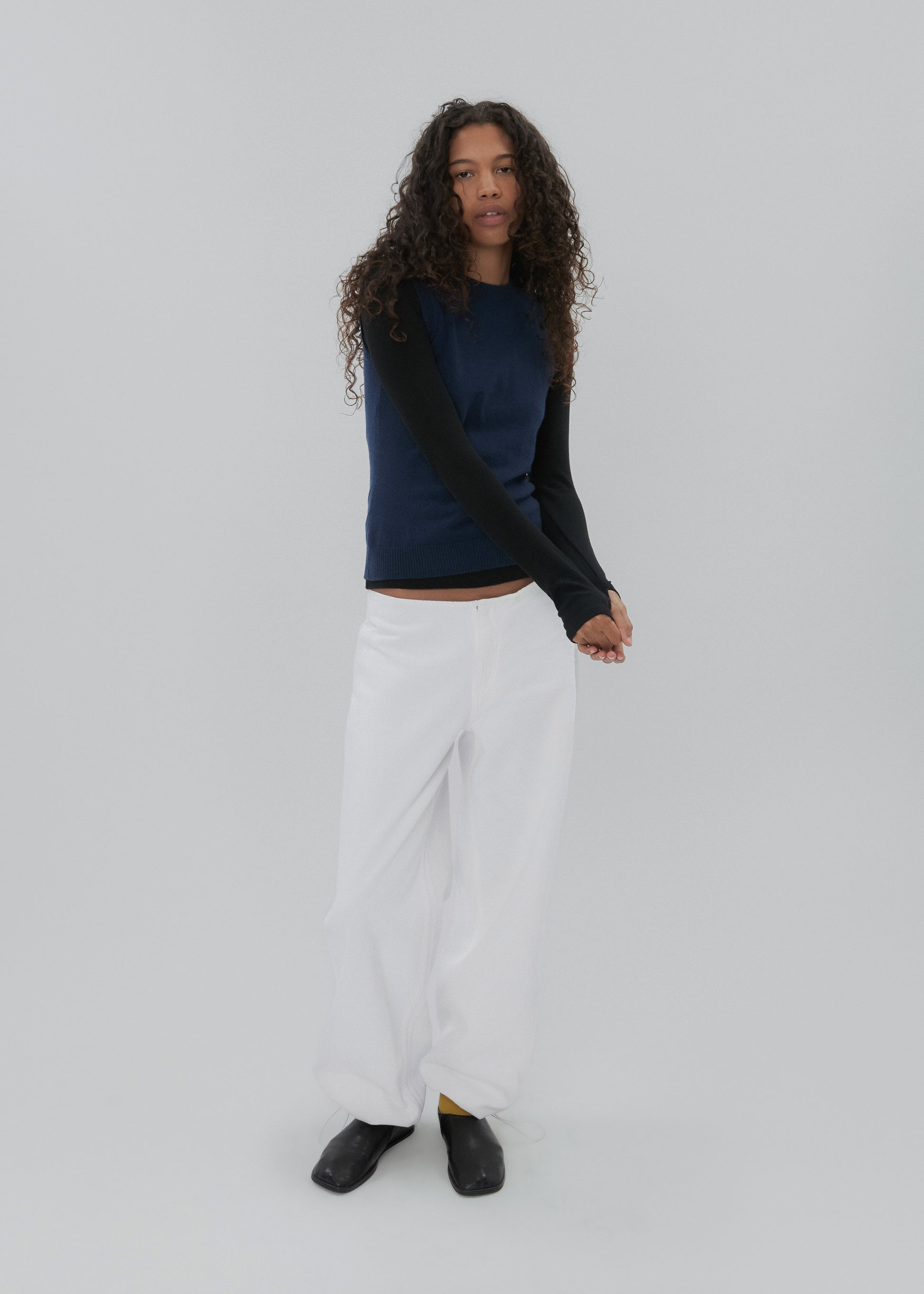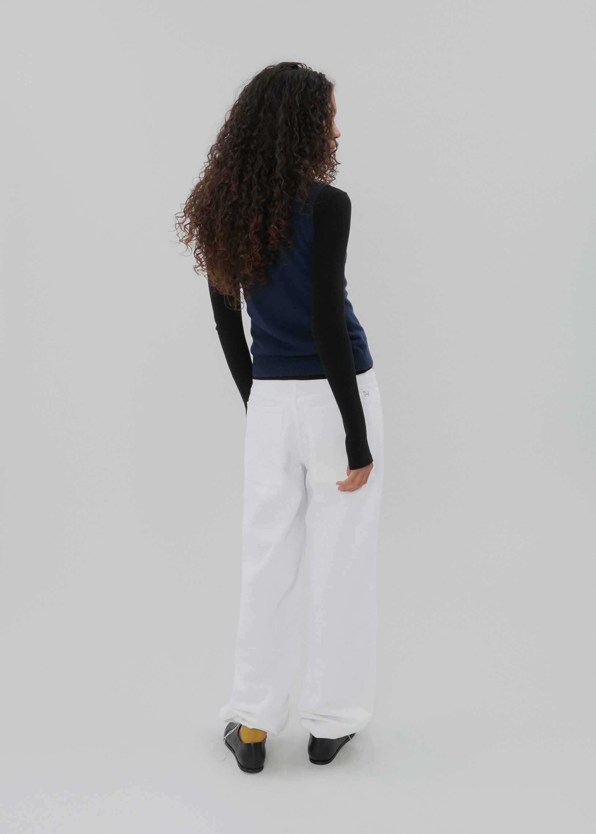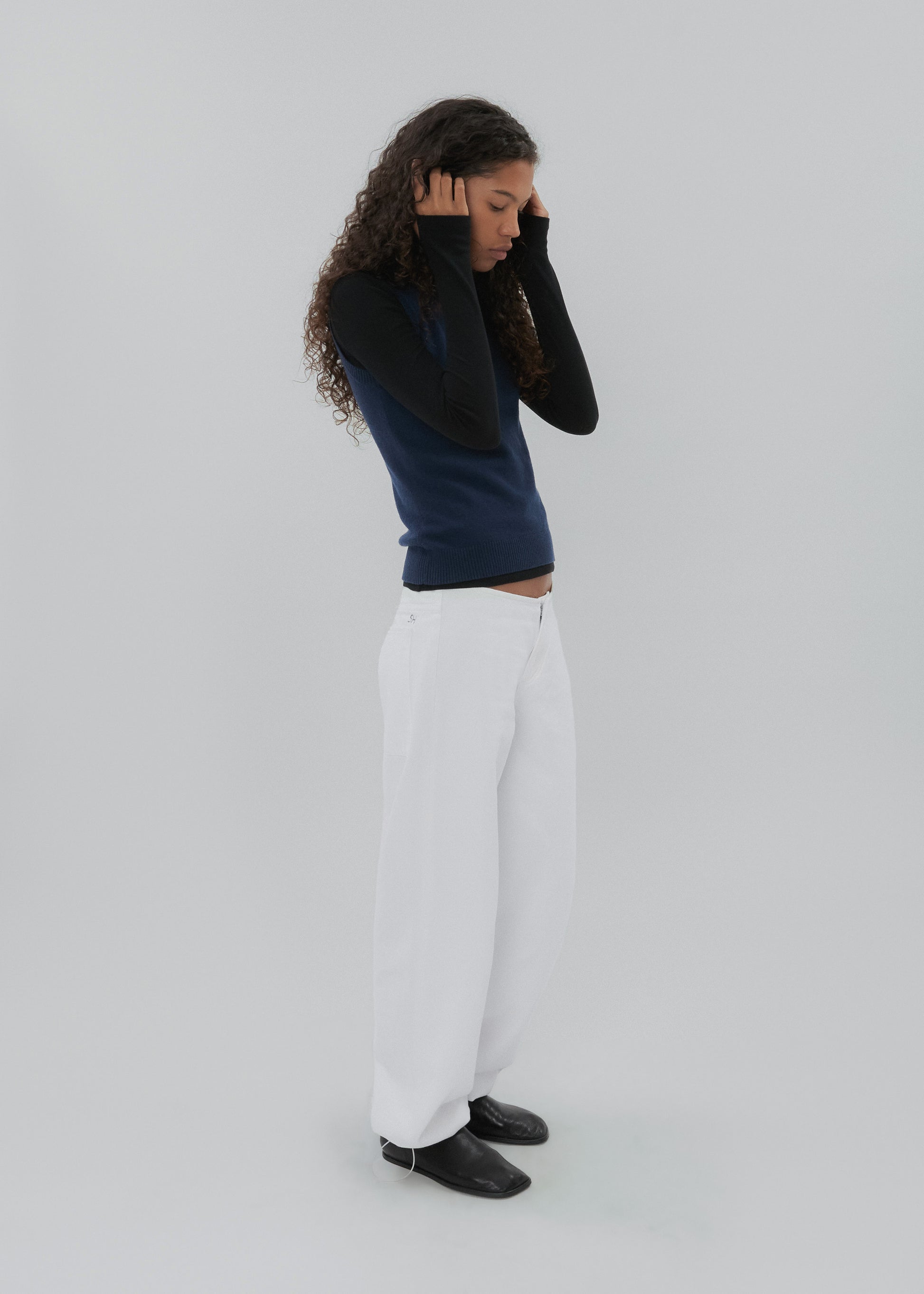 The Sport Jean is a low-rise, relaxed-leg jean with drawstring toggles at both hems, allowing for both a cinched jeanie leg or straight leg wear. Featuring a waistband-free construction and a discreet zipper closure for an uninterrupted silhouette.