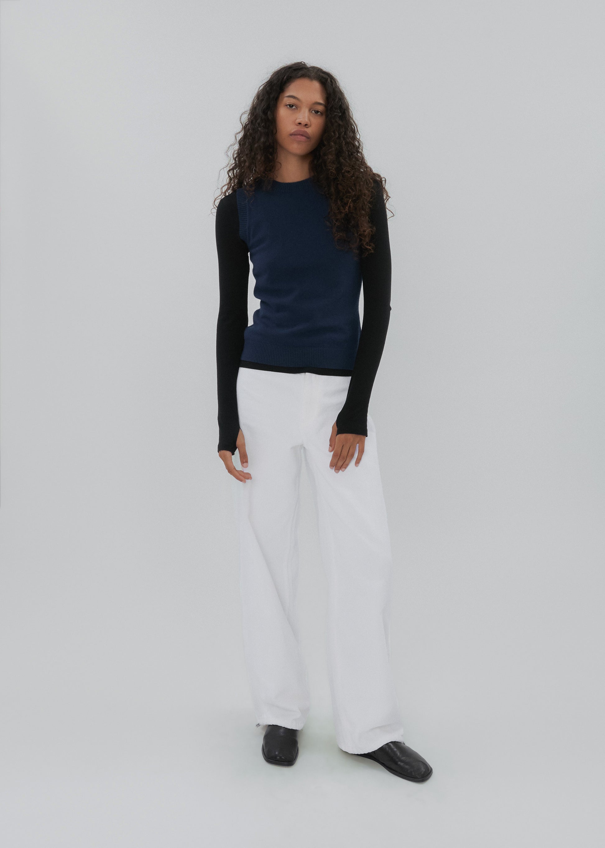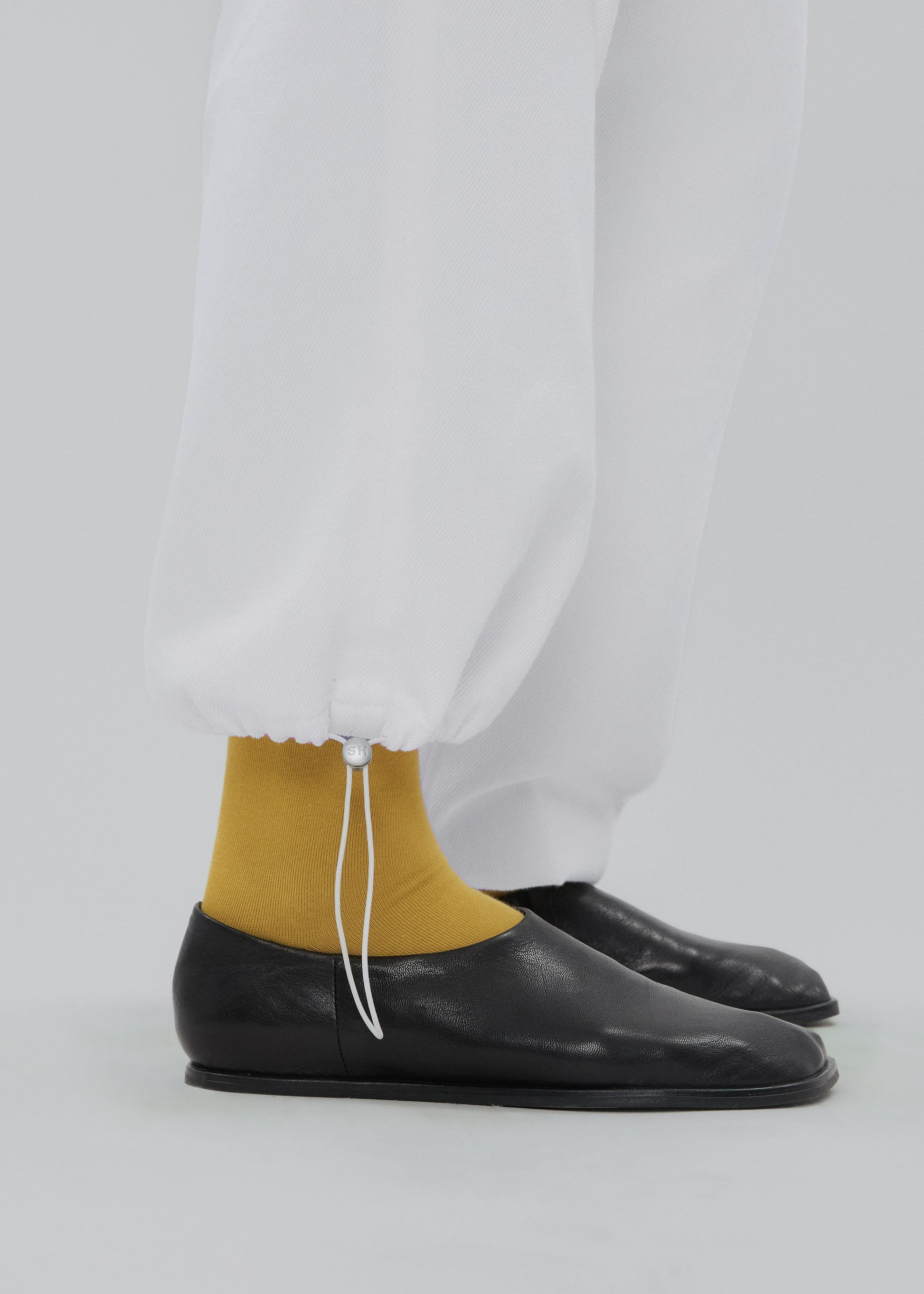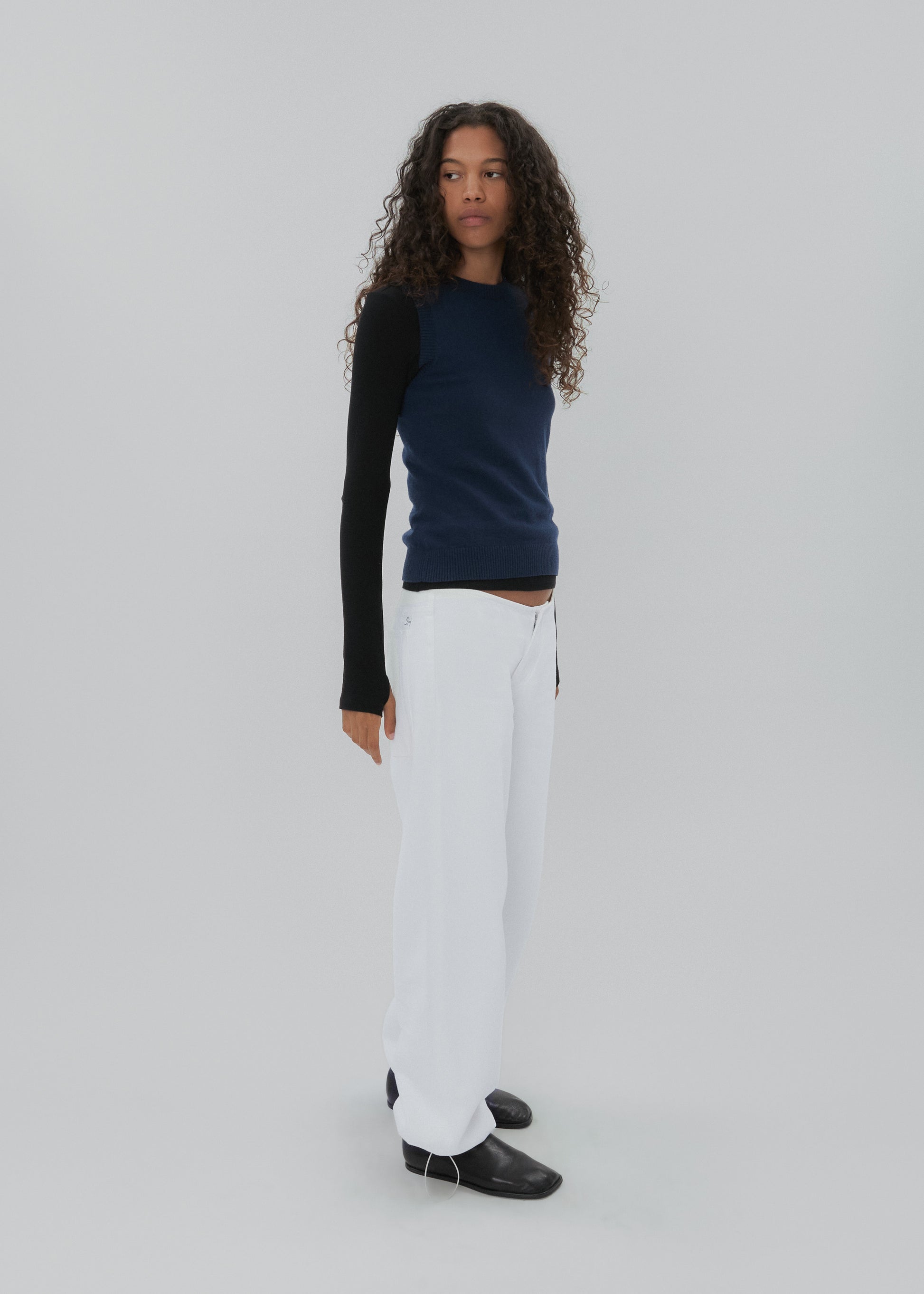 The Sport Jean is a low-rise, relaxed-leg jean with drawstring toggles at both hems, allowing for both a cinched jeanie leg or straight leg wear. Featuring a waistband-free construction and a discreet zipper closure for an uninterrupted silhouette.