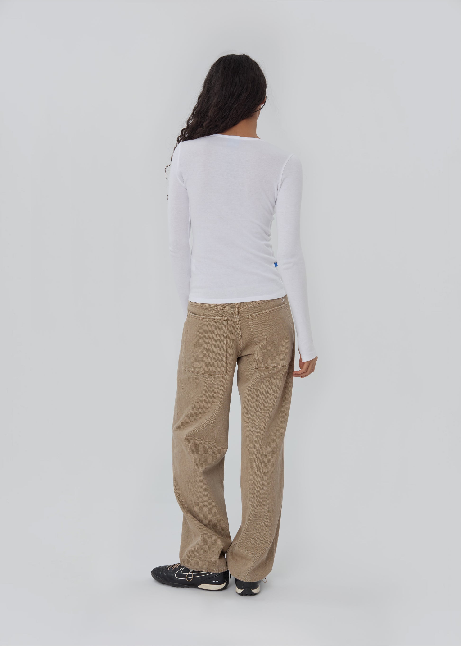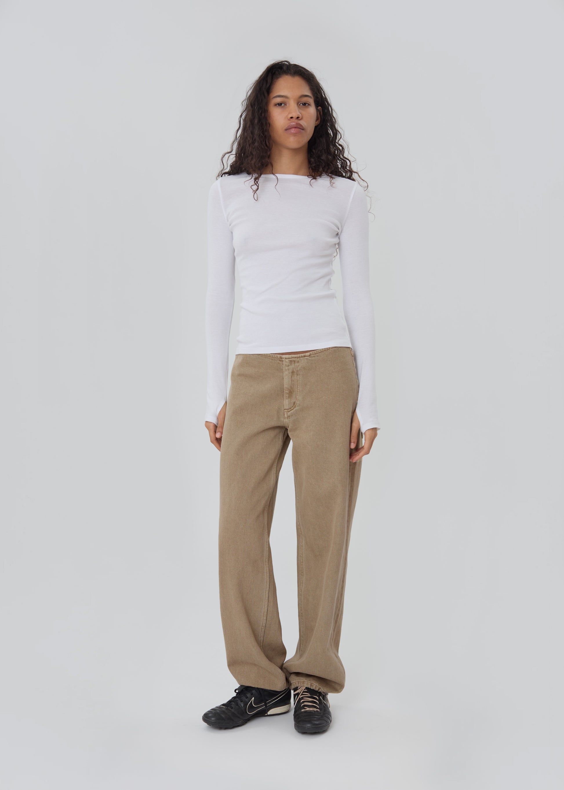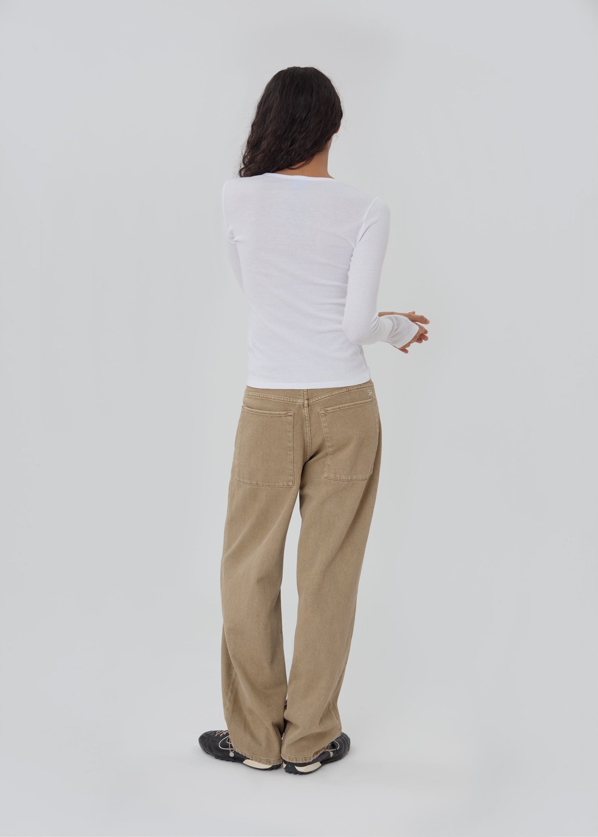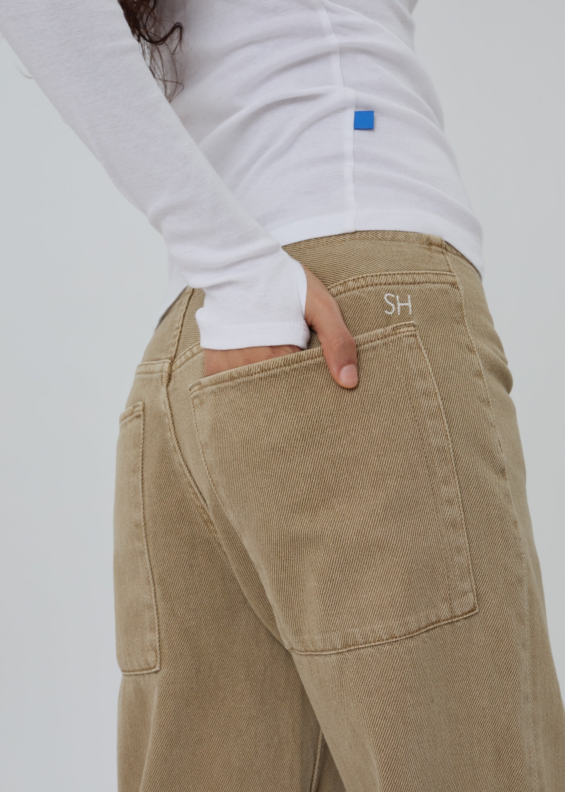 The Sport Jean is a low-rise, relaxed-leg jean with drawstring toggles at both hems, allowing for both a cinched jeanie leg or straight leg wear. Featuring a waistband-free construction and a discreet zipper closure for an uninterrupted silhouette.